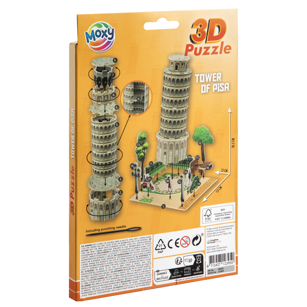 3D slagalica od pene za pravljenje krivog tornja u Pizi. Takođe, slagalice su dostupne i u dizajnu sa Kipom slobode i Ajfelovim tornjem u Parizui. Dimenzije slagalice su 13x21cm. Uključuje iglu za bušenje pene. U svakom pakovanja nalazi se 30 delova slagalice od pene. Na poleđini pakovanja pronađite brojeve, koji će Vam pomoći da sklopite slagalicu. Svaki broj ukazuje gde je i kojoj slagalici mesto. 3D slagalica je pogodna za decu od 6 godina.