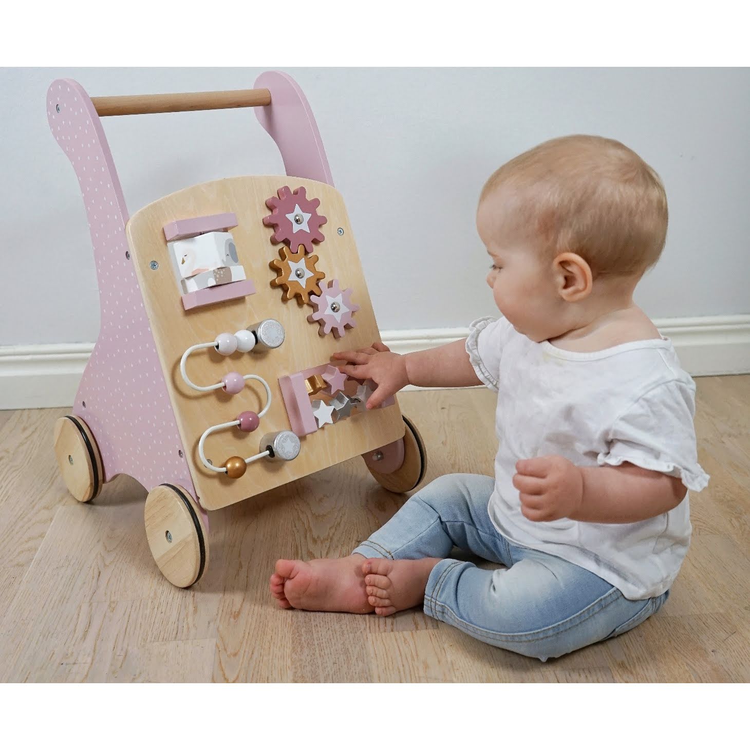 Activity Wagon je drvena guralica sa točkićima, drškom i čvrstom konstrukcijom idealnom za prve korake vaših mališana. Sa unutrašnje strane guralice se nalazi pregrada za odlaganje igračaka, a na prednjoj edukativna tabla sa zabavnim sadržajima poput loptica, zupčanika i brojalice.