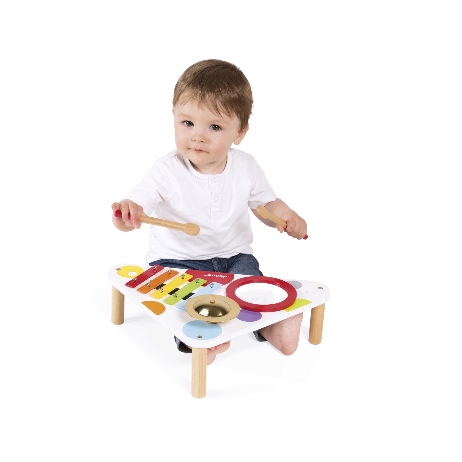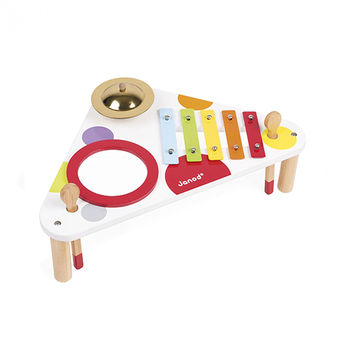 Janod muzički sto sastavljen je od ksilofona, činela i bubnja. Uključuje 2 udaraljke prilagođene malim dečijim ručicama. Crvena, žuta, zelena, narančasta … Confetti, kompletna linija muzičkih instrumenata sa Pop N “Rock dizajnom! Confetti budi sva čula i upoznjea najmlađe muzičare sa radostima muzičke improvizacije.