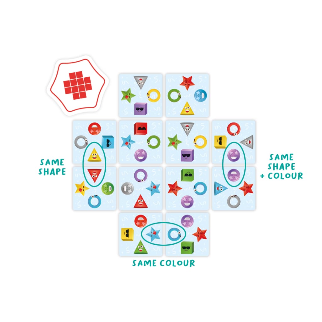Igra sadrži 24 karate sa šablonom (4 nivoa težine), 56 karata za igru (sa po 4 slike) namenjena je za decu od 5+ godina, može je igrati 2 do 4 igrača i za svaku partiju je potrebno 20 minuta. Pravila igre možete pronaći na QR kodu deklaracije koja se nalazi na pakovanju, kao i na ovoj stranici.